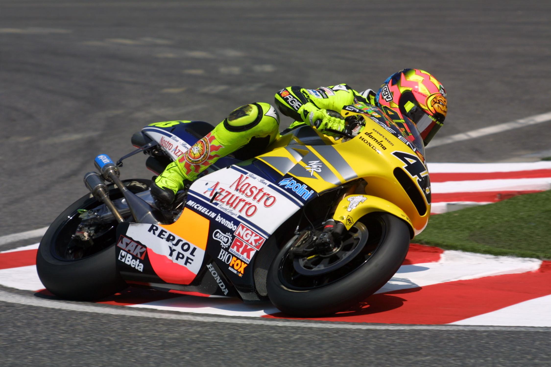 Valentino Rossi, pilotando a lendária Honda NSR 500 2 tempos, foi campeão em 2001, o último ano da categoria 500. No ano seguinte, o mesmo Rossi foi campeão novamente, mas desta vez pilotando uma Honda RC 211V, a primeira campeã da MotoGP dotada de um fantástico motor de cinco cilindros em V com tecnologia 4 tempos.