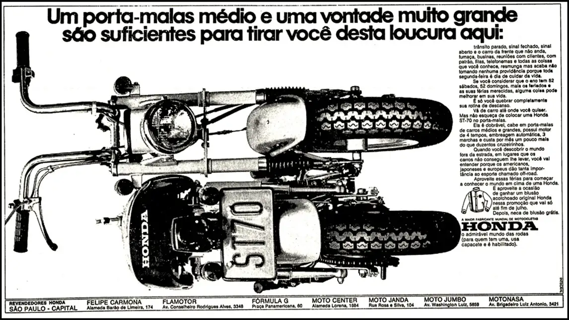 A Honda ST 70, lançada no Brasil no início dos anos 1970, fez parte do lineup inaugural da marca no país como importadora. Esse modelo icônico rapidamente se destacou por suas características inovadoras que conquistaram muitos motociclistas.
