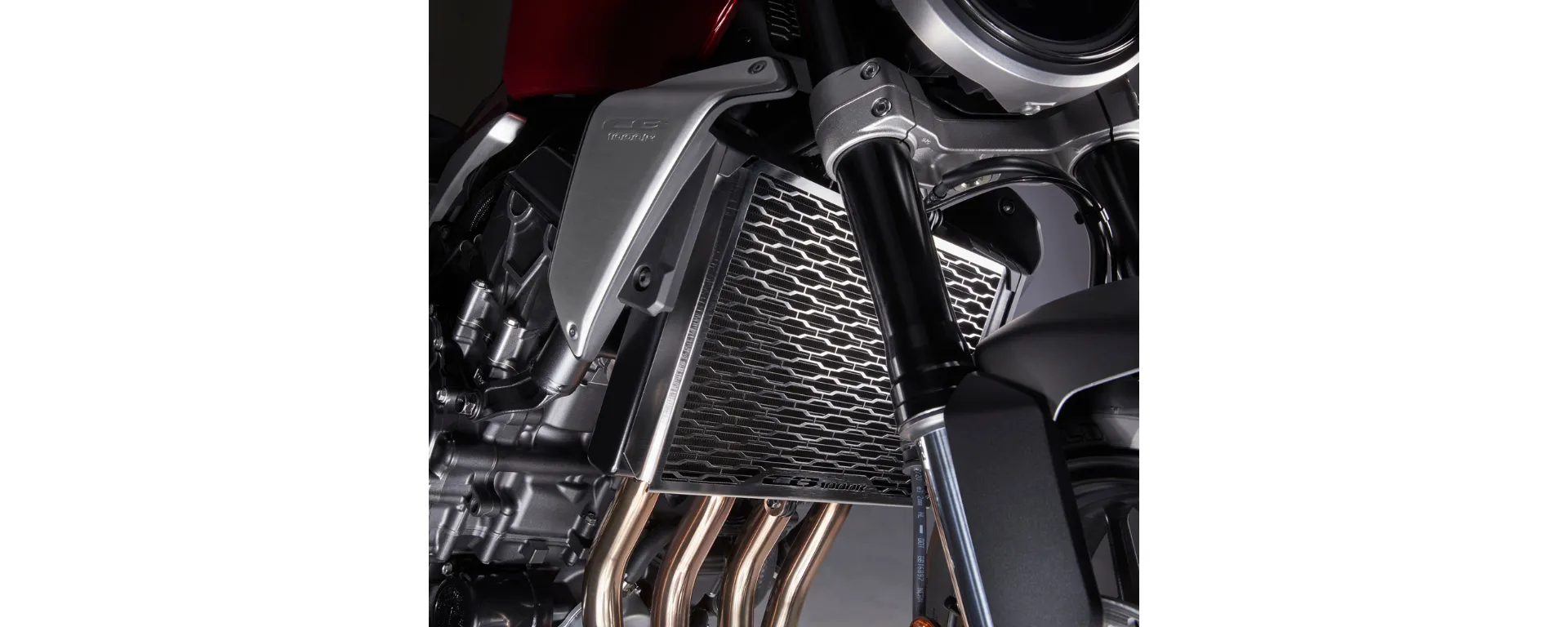 O protetor de radiador em alimínio escovado com a assinatura CB 1000R garante estilo e proteção para a frente da motocicleta.