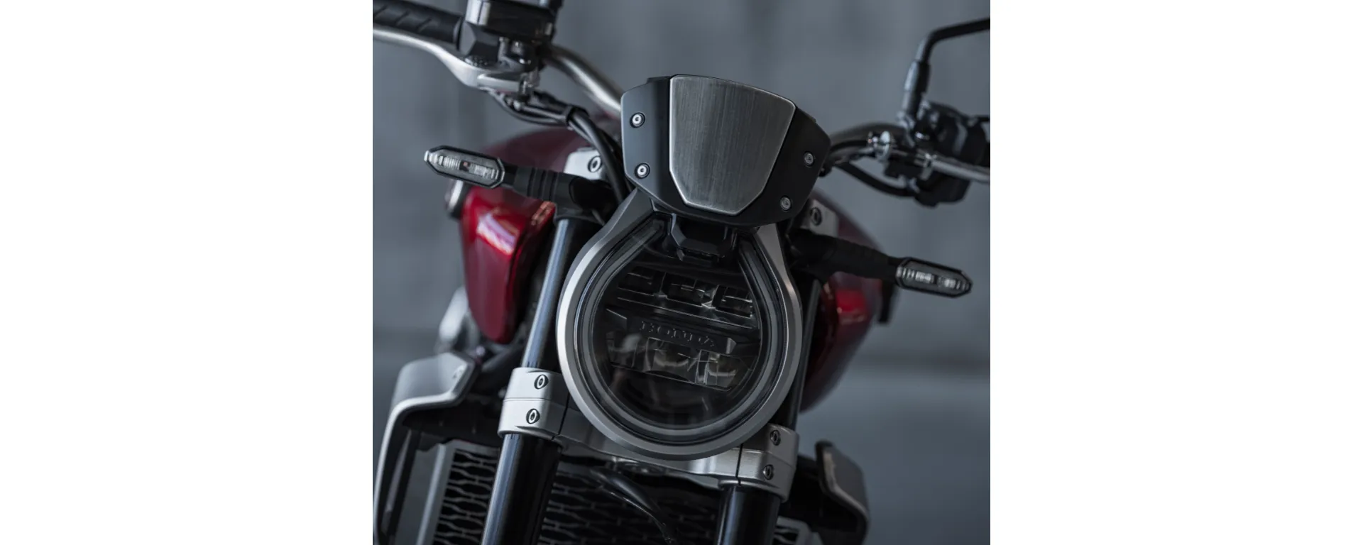 O conjunto óptico da nova CB 1000R apresenta luzes de direção na clássica cor âmbar e um farol circular característico da linha Neo Sports Café, composto pelo sistema DRL (Daytime Running Light) em um sofisticado formato de “gota” e bloco ótico bipartido em LED.