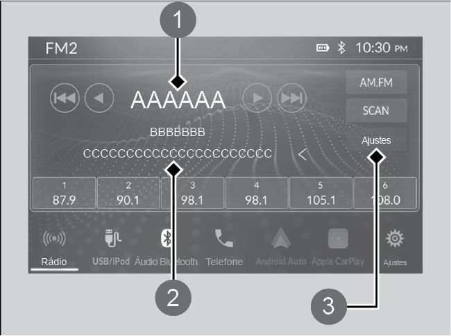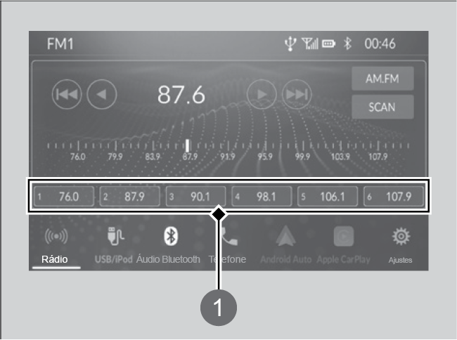 Selecione Rádio, USB/iPod, Áudio Bluetooth, Telefone, Apple CarPlay, Android Auto ou Ajustes, na parte inferior da tela áudio/ informação.
