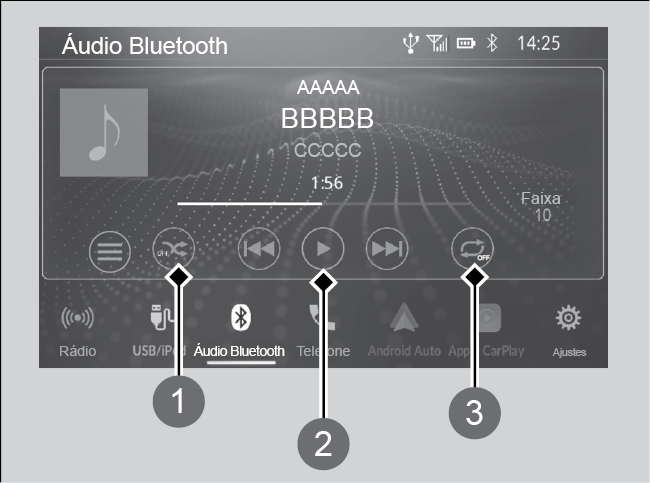 Para reproduzir um arquivo de áudio, você pode necessitar operar seu telefone. Se for necessário, siga as instruções de operação do fabricante do telefone. Alternando para outro modo, a música reproduzida pelo seu telefone é pausada. Alguns modos de reprodução podem não estar disponíveis em alguns dispositivos. |