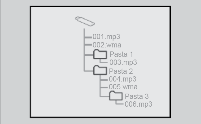 O formato suportado dos arquivos estão indicados principalmente pelo nome da extensão do arquivo. Algumas versões dos formatos de arquivos suportados podem não ser reproduzidos. O sistema de áudio somente suporta a reprodução de arquivos do dispositivo USB, codificados com o formato descrito anteriormente. Se você encontrar um arquivo que não pode ser reproduzido, significa que seu formato de arquivo, não é um formato suportado pelo sistema de áudio, o que impede que ele seja reproduzido. Arquivos protegidos por gerenciamento digital de direitos autorais (DRM) não são suportados pelo sistema de áudio. |