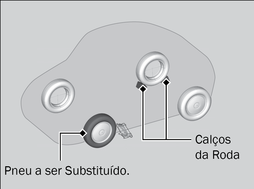 O veículo pode soltar-se do macaco, ferindo gravemente qualquer pessoa que esteja embaixo dele. Siga exatamente as instruções para a substituição do pneu. Nunca permita que qualquer pessoa coloque alguma parte do corpo embaixo do veículo apoiado por um macaco. O macaco deverá ser colocado apenas em solo firme e plano, no mesmo nível em que o veículo se encontra estacionado. |