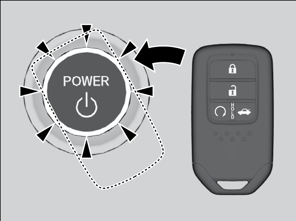 1. Toque no centro do botão POWER com o logotipo H do controle remoto de acesso sem chave, enquanto o botão POWER estiver piscando. Os botões do controle remoto do acesso sem chave devem estar voltados para você.