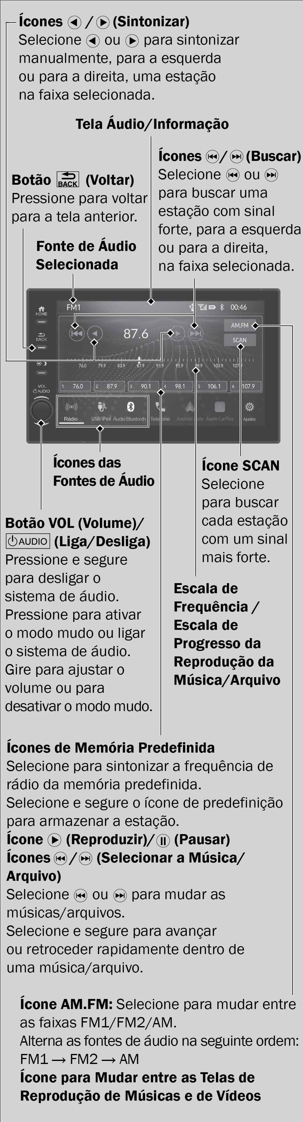 Pressione para mudar a fonte de áudio: FM1 → FM2 → AM → USB/iPod*¹ → Áudio Bluetooth*¹.