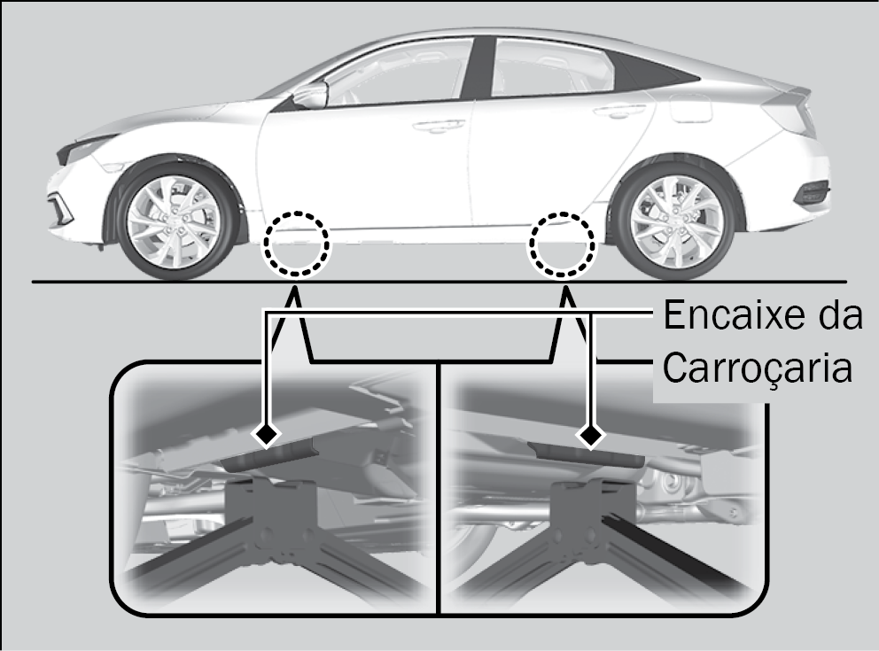 Não use o macaco com pessoas ou bagagens no interior do veículo. Use o macaco fornecido com o veículo. Outros macacos poderão não suportar o peso do veículo ou podem apresentar formato incompatível com o encaixe da carroçaria. |