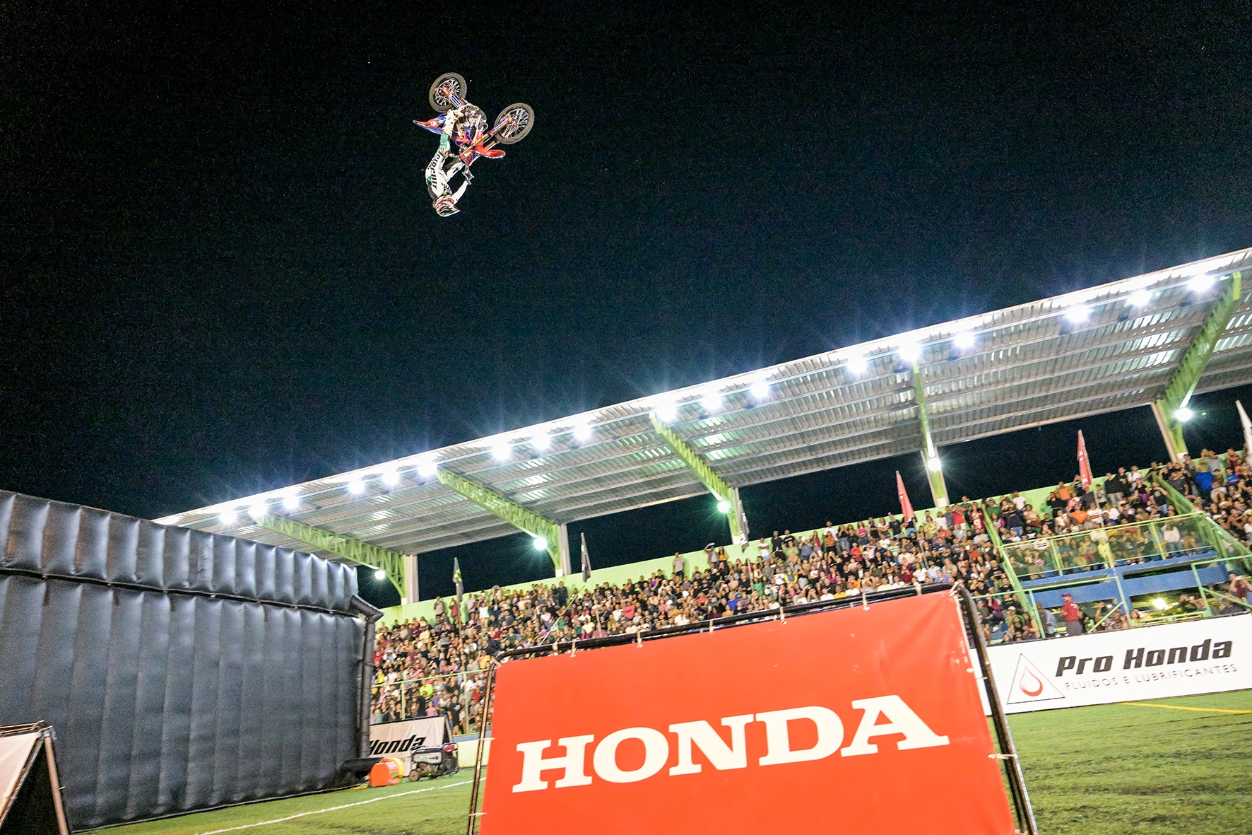 Ilhabela (SP) – O Arena Freestyle Show lotou as arquibancadas de Ilhabela (SP) na noite deste sábado (16/9), na rampa montada no Campo do PEII. A segunda etapa do evento foi válida pelo Campeonato Brasileiro de Freestyle Motocross, com o patrocínio de Honda e Pro Honda.
