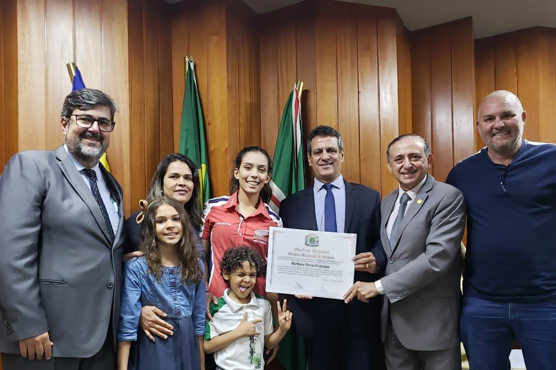 Goiânia (GO) - A piloto Bárbara Neves, da equipe Honda Racing, foi homenageada nessa quinta-feira (12/12), pela Câmara Municipal de Goiânia (GO), devido ao reconhecimento do desempenho da atleta na temporada. Ao lado da família, ela participou da cerimônia que homenageou também o carateca local Davi Serqueira, destaque nacional e internacional da modalidade.