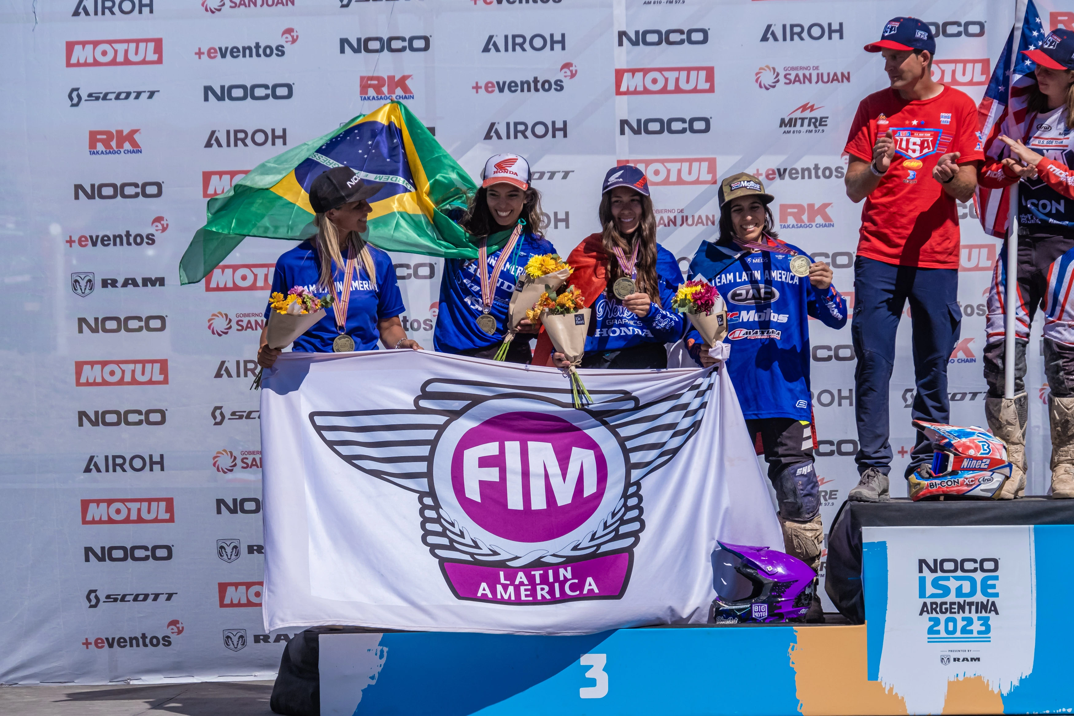 San Juan (Argentina) – Bárbara Neves fez história para o Brasil no International Six Days Enduro (ISDE). Primeira brasileira na disputa por Seleções, a goiana foi ao pódio em terceiro lugar, ao lado da equipe latino-americana feminina – que também contou com as chilenas Tania Gonzalez e Valeria Rodriguez. A brasileira acelerou a Honda CRF 250F, levando pela primeira vez a motocicleta de fabricação nacional até o pódio de um evento internacional. A principal competição do enduro teve fim neste sábado (11/11), após seis dias de disputas em San Juan, Argentina.