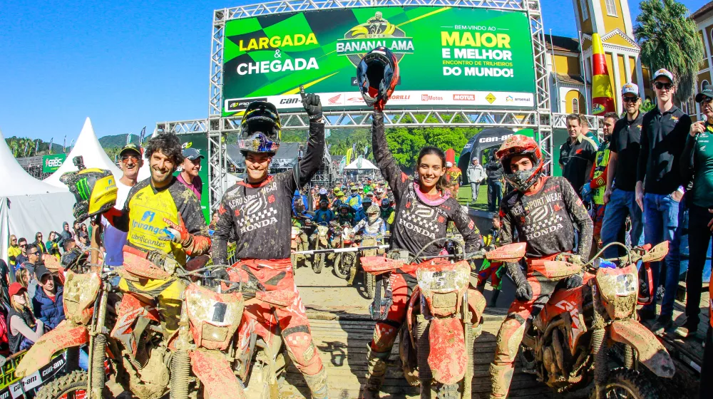 Corupá (SC) – A pequena cidade de Corupá (SC) voltou a ser a capital mundial da trilha com a realização do Super Bananalama 2019. Reconhecido pelo livro dos recordes como o maior encontro de trilheiros do planeta, o evento terminou neste domingo (7) após quatro dias de muitas atrações. O número de inscritos foi o maior já registrado, 5.031, sendo 4.609 motocicletas. Bruno Crivilin, Gabriel Soares e Bárbara Neves, pilotos da equipe Honda Racing de Enduro, tiveram a experiência inédita de acelerar ao lado de outros tantos apaixonados pelo off-road com a CRF 250F, a moto oficial do Super Bananalama.