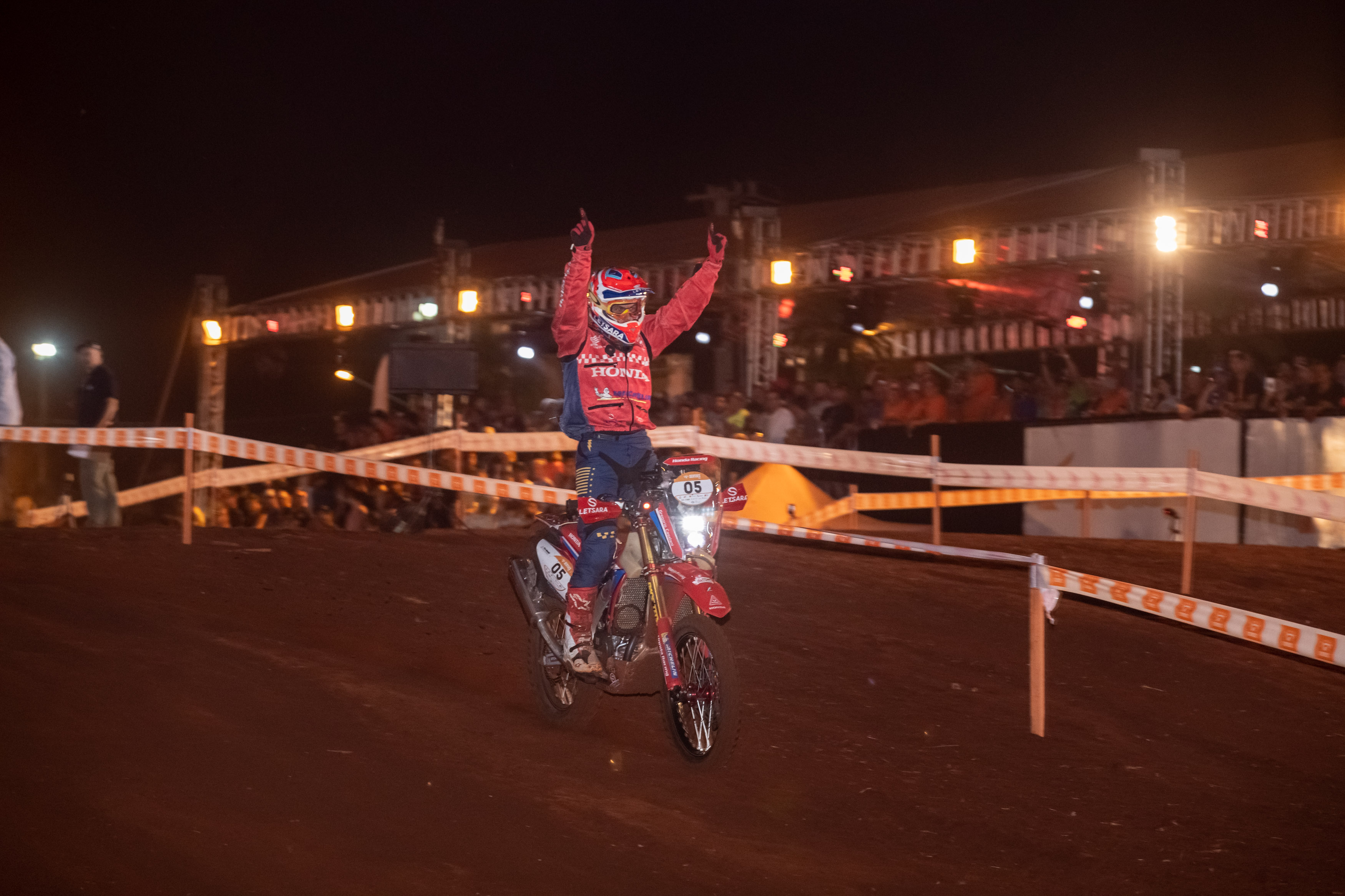 Campo Grande (MS) - O piloto Gregorio Caselani, da equipe Honda Racing, agitou o público ao vencer o Super Prime entre as motocicletas do Sertões 2019, na noite deste sábado (24), na arena montada na Praça do Papa, em Campo Grande (MS). O duelo final foi disputado com o companheiro de equipe Jean Azevedo.
