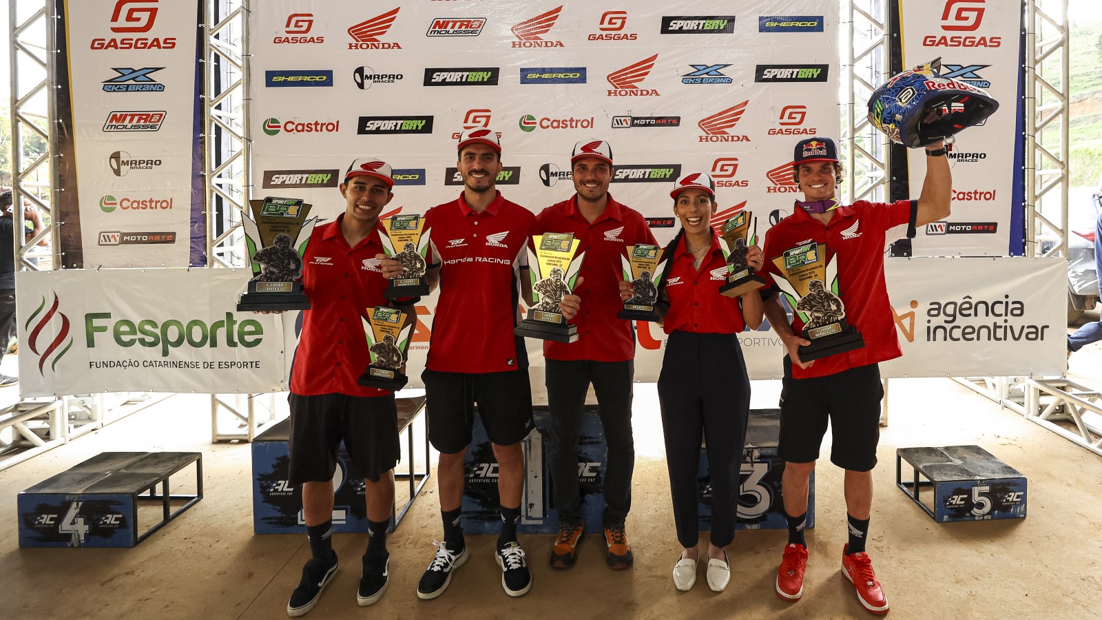 Canelinha (SC) – Os pilotos da equipe Honda Racing colocaram as mãos nos títulos do Campeonato Brasileiro de Enduro 2025. A garantia virtual das conquistas em três categorias veio neste fim de semana (4 e 5/10), na cidade de Canelinha, Santa Catarina, que sediou a sexta e penúltima rodada do ano. O time comandado por Rômulo Bottrel reafirmou sua supremacia, com Vinicius Calafati (E1), Luciano Rocha (E3) e Bárbara Neves (EF) no alto do pódio. Desta forma, basta largarem na prova final da competição, nos próximos dias 25 e 26, em Patrocínio (MG), para comemorarem as taças. Bruno Crivilin também venceu e está muito perto das taças da Elite (classificação combinada das principais categorias) e da classe E2.