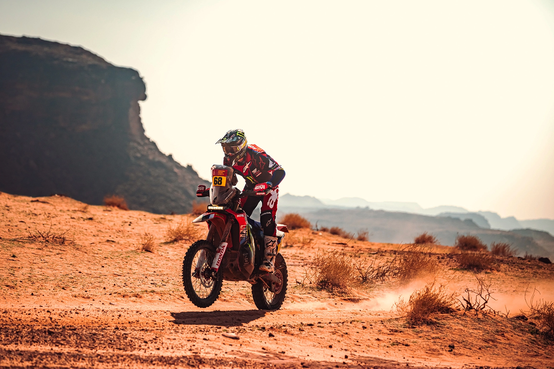 Uma fria manhã em Al Henakiyah marcou o início da Maratona para o quinteto da Monster Energy Honda HRC. Pela frente, em meio às belas paisagens das formações rochosas rumo a AlUla, patrimônio mundial da Unesco, um percurso técnico, com trilhas em regiões de rochas vulcânicas.
