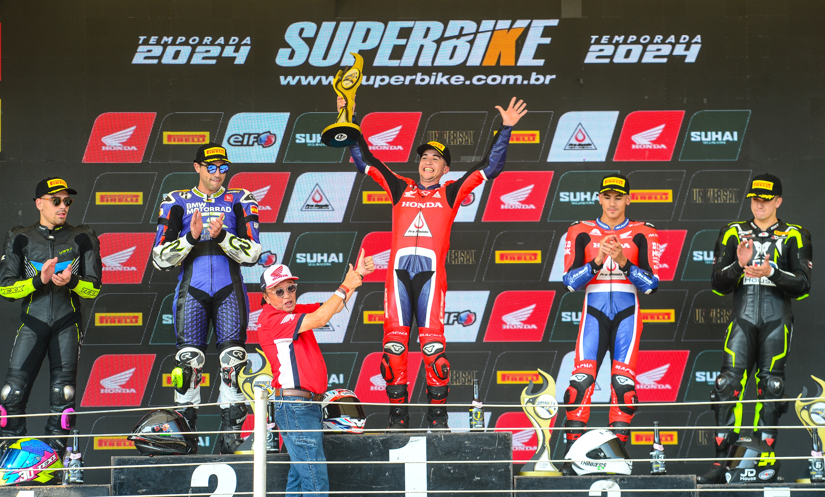 “Estou feliz demais pela primeira vitória, é inesquecível. Imprimi um ritmo muito forte desde o começo e mantive a liderança, mesmo com as pausas na corrida, sem ninguém me ameaçar. Só tenho a agradecer a equipe Honda Racing”, festejou Carneiro, que com o resultado assume o terceiro lugar na tabela da principal categoria do SuperBike Brasil. Ele é resultado do trabalho de base realizado na Copa Pro Honda CBR 650R, na qual conquistou dois títulos.