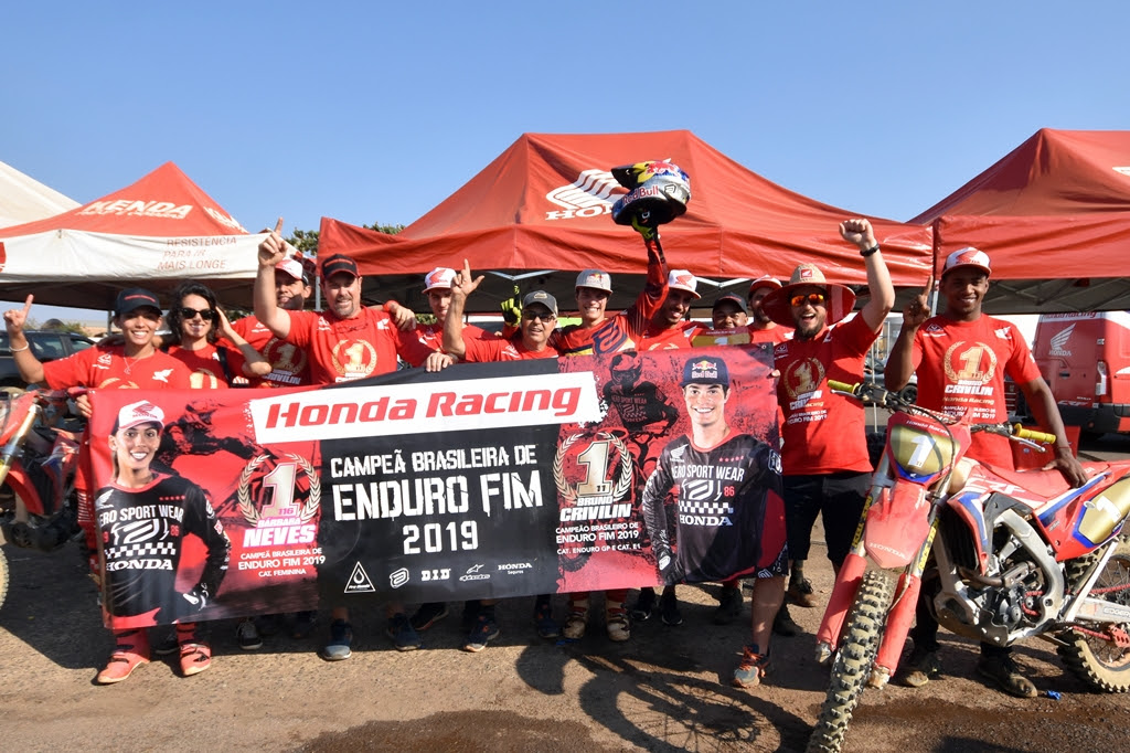 Patrocínio (MG) - A equipe Honda Racing está em festa pela conquista de três títulos no Campeonato Brasileiro de Enduro FIM 2019, neste domingo (15/9), em Patrocínio (MG). O capixaba Bruno Crivilin foi o grande destaque e fechou a temporada com o bicampeonato nas categorias E1 e Enduro GP, direcionada aos mais rápidos da competição. Ele acelerou a motocicleta Honda CRF 250RX. Além disso, a goiana Bárbara Neves confirmou a taça da classe EF, a segunda da sua carreira, pilotando o modelo nacional Honda CRF 250F.