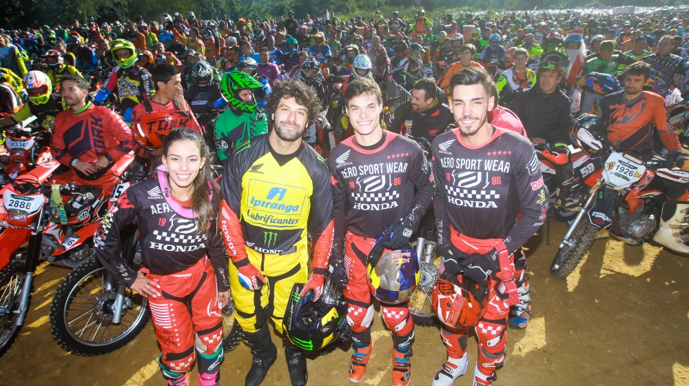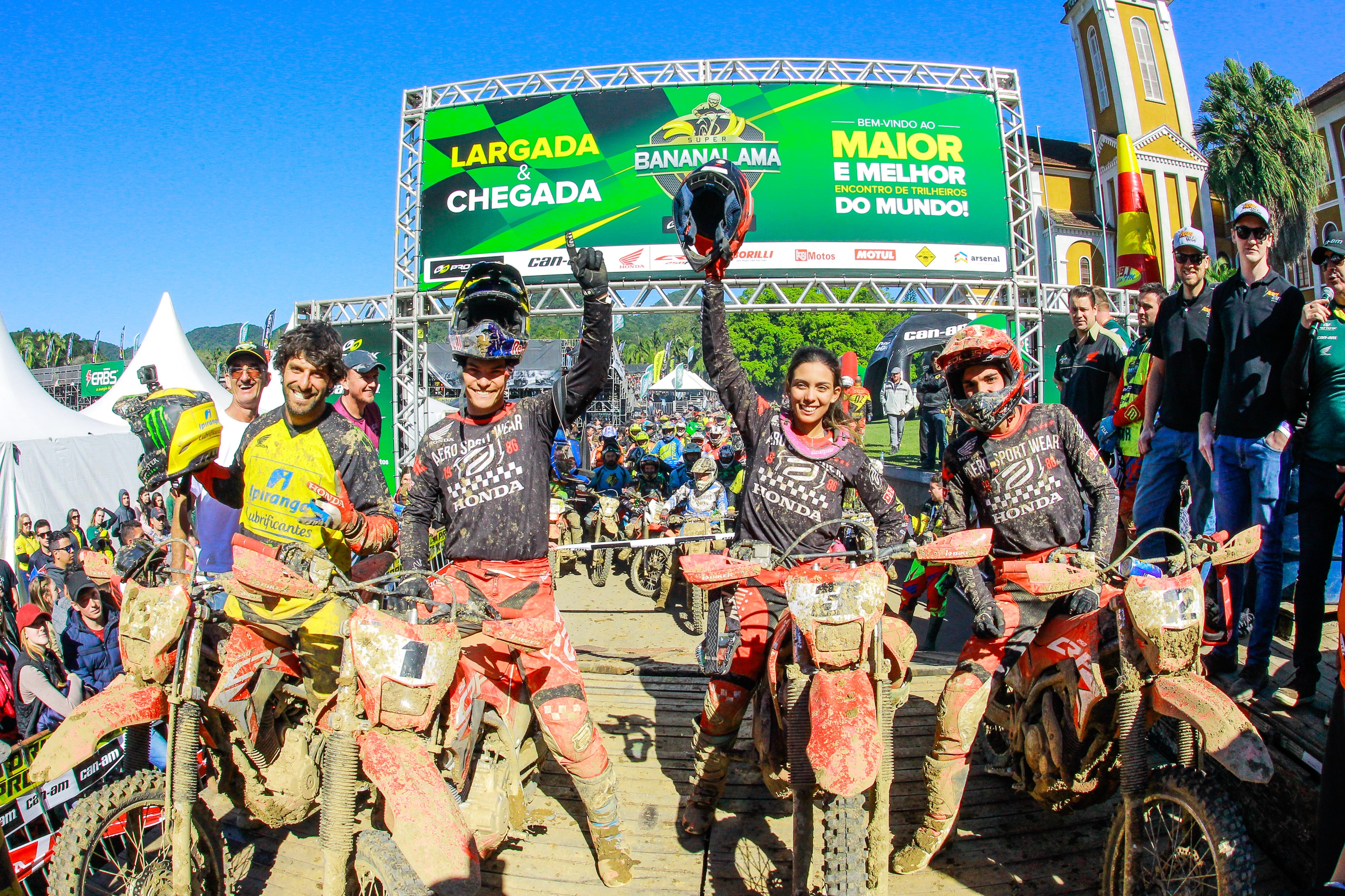 Corupá (SC) – A pequena cidade de Corupá (SC) voltou a ser a capital mundial da trilha com a realização do Super Bananalama 2019. Reconhecido pelo livro dos recordes como o maior encontro de trilheiros do planeta, o evento terminou neste domingo (7) após quatro dias de muitas atrações. O número de inscritos foi o maior já registrado, 5.031, sendo 4.609 motocicletas. Bruno Crivilin, Gabriel Soares e Bárbara Neves, pilotos da equipe Honda Racing de Enduro, tiveram a experiência inédita de acelerar ao lado de outros tantos apaixonados pelo off-road com a CRF 250F, a moto oficial do Super Bananalama.